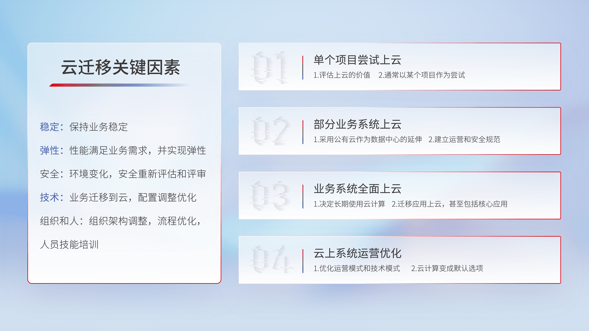 结合实际业务,,,,从规划设计、、、云平台选型、、、云原生改造、、、数据迁移、、、、集成交付,,迁移全过程为客户识别最佳上云路径,,,,做好风险识别管理,,,,设计网络架构、、、身份权限、、、安全审计合规、、操作审计、、、、日志审计、、、监控告警策略、、多站点容灾设计等,,,对云上基础设施进行整体规划,,,,提升IT治理水平,,以满足弹性、、、、高可用、、、高性能的需求。。。