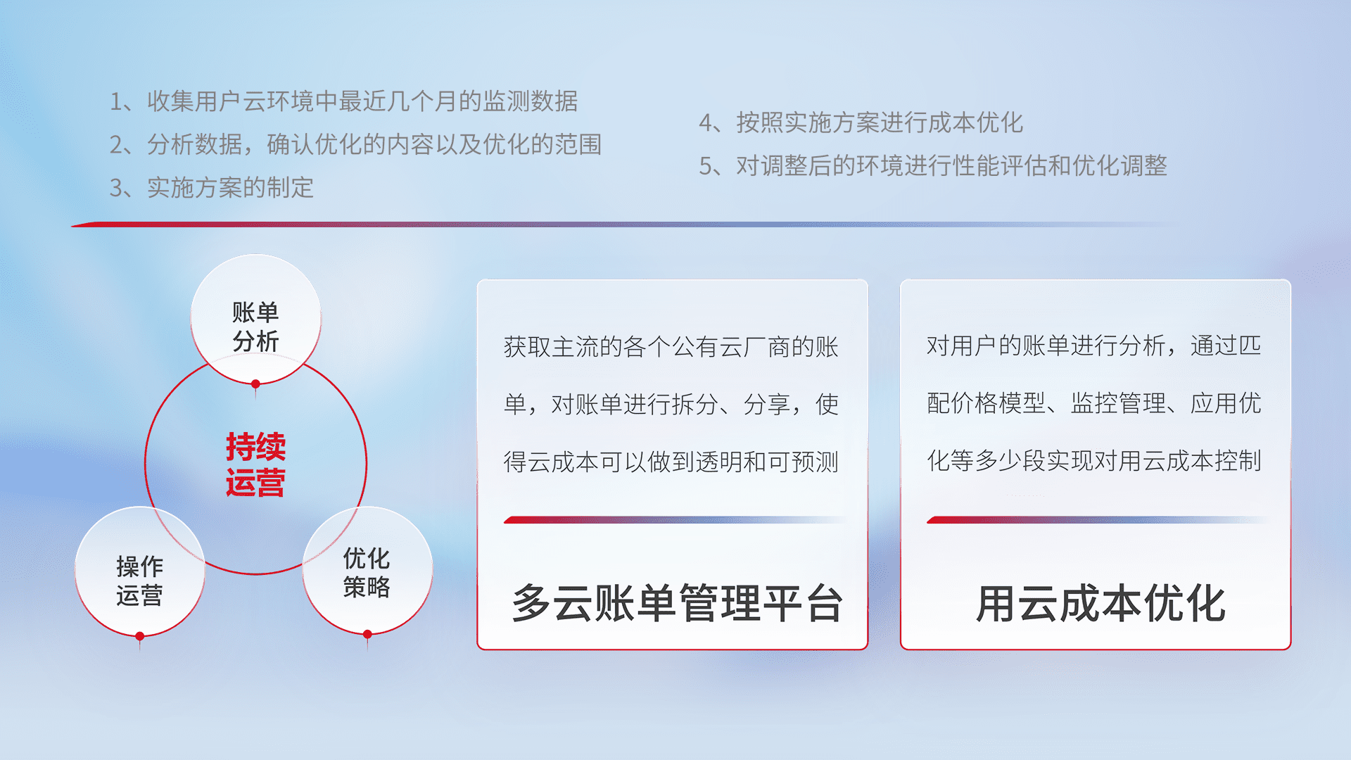 通过多云纳管,,,,以统一的资源数据模型把客户的云资源进行抽象和封装,,,进而实现对多云资源的统一操作,,,,保障云资源管理的可靠性、、稳定性与可用性。。。。量身定制化运维内容,,,,配置、、开发运维、、补丁管理、、、、备份、、、、监控、、、认证和访问管理、、、审计和日常巡检等,,,,保障在用云过程中的可靠度,,,,稳定度以及高可用率。。。